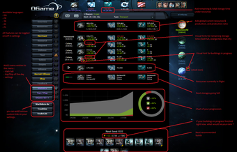 Fitur tambahan termasuk rekomendasi pembangunan berikutnya yang membantu pengguna memahami pengembalian investasi dari tambang mereka, serta pengisian otomatis pada kolom teks satelit solar jika energi negatif. Pengguna juga dapat melihat peringkat harian server untuk kenaikan atau penurunan poin terbesar, serta ikon pengiriman dan transportasi cepat saat mengarahkan kursor ke planet. Ogame UI memungkinkan penambahan tautan kustom di menu kiri untuk akses yang lebih mudah.